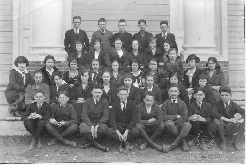 Photo taken on the auditorium steps of the OLD Accomac School before the brick one was built. That building (the auditorium) then became the gymnasium. Elizabeth (Clampitt) Dukes, is second from left on second row from the bottom. Hayden Russell (oldest son of the Charles F. Russell who built the Whispering Pines) is fifth from left on the bottom row. They lived in Greenbush at that time.