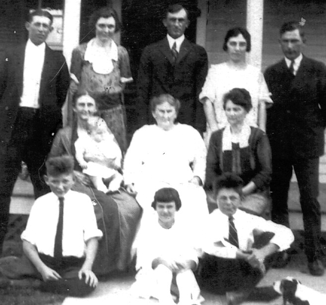 This photo, taken in approximately 1917, depicts Julia Ann DOWNING "Miss Julia" Sturgis, of Marionville, VA, and her family. Miss Julia had two daughters, Roberta May STURGIS "Miss Bertie" Goffigon (seated holding baby) and Sarah STURGIS, Meyers, seated on the other side of Miss Julia. Miss Bertie, who married Obediah George GOFFIGON, had three children: Oliver, Polly, and Rudolph Sturgis GOFFIGON. In the back row of this photo, you will see: Leon REED, Polly GOFFIGON Reed, (probably: Henry STURGIS, brother of Miss Julia), (probably Edith Goffigon, wife of Oliver), Oliver GOFFIGON. Seated: Rudolph GOFFIGON. The other two children possible of Sarah Meyers. Baby thought to be Leon REED Jr.
