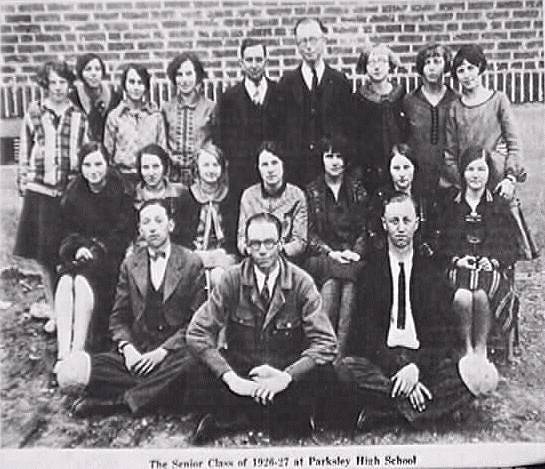 1926-27 Parksley High School Senior Class. The first person, second row, on the left is Eva Virginia Justis (Burn), and the second person on that row is Evelyn C. Justis (Wampler).